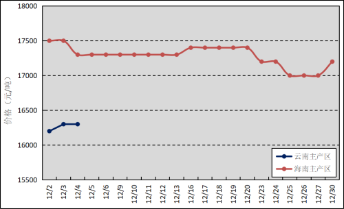 國內(nèi)主產(chǎn)區(qū):12月,云南產(chǎn)區(qū)在月初基本停割,海南產(chǎn)區(qū)原料產(chǎn)出較上月有所縮減。云南、海南鮮膠乳(折干膠)月均價格分別為16276元/噸、17282元/噸,環(huán)比上漲119元/噸、96元/噸。