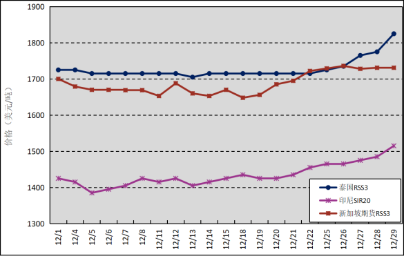 國外主產(chǎn)區(qū):12月,泰國RSS3平均價格為1727美元/噸,環(huán)比上漲41美元/噸,最高價為1825美元/噸,最低價為1705美元/噸;印尼SIR20平均價格為1434美元/噸,環(huán)比下跌21美元/噸,最高價為1515美元/噸,最低價為1385美元/噸;新加坡RSS3期貨主力合約月均結(jié)算價格為1688美元/噸,環(huán)比下跌1美元/噸,最高價為1736美元/噸,最低價為1648美元/噸