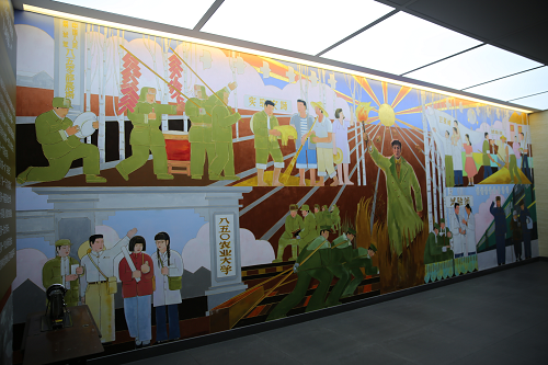 第一展廳,主題是傳承紅色基因。采用紅色色調(diào),展示了自制定開發(fā)北大荒的戰(zhàn)略決策起,到黑龍江生產(chǎn)建設(shè)兵團時期的發(fā)展歷程。主要展品有:半景畫“英雄的足跡”、微縮景觀“艱難建場”、大型壁畫“九個第一”(右圖)、鐵道兵軍品等。