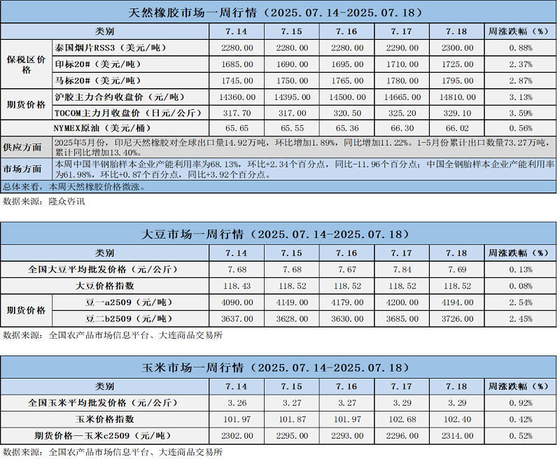 天然橡膠、大豆、玉米市場(chǎng)一周行情(2025.07.14-07.18)