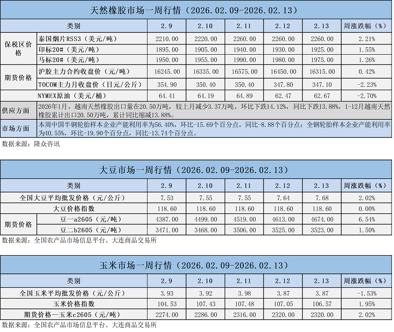 天然橡膠、大豆、玉米市場(chǎng)一周行情(2026.02.09-02.13)