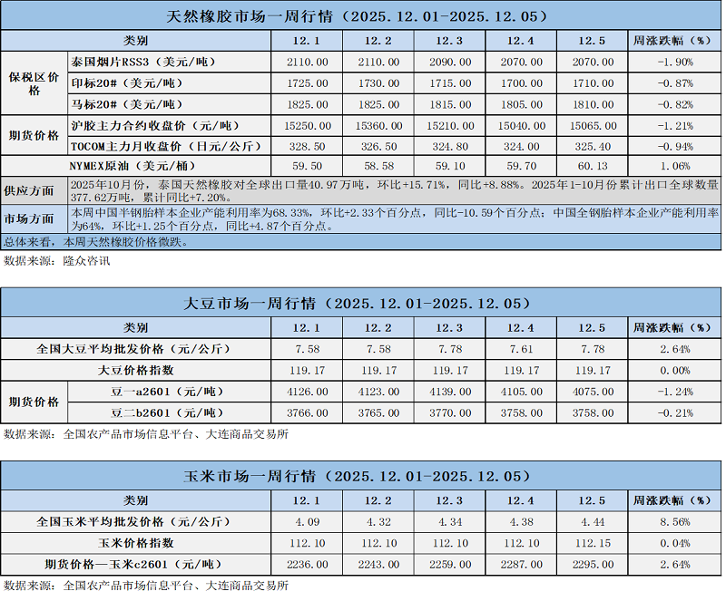 天然橡膠、大豆、玉米市場一周行情(2025.12.01-12.05)