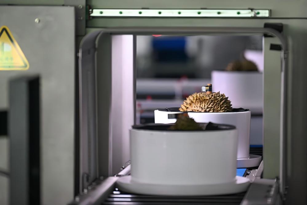 7月18日,在位于海南三亞的海南省優(yōu)旗農(nóng)業(yè)有限公司榴蓮加工廠,國產(chǎn)榴蓮在榴蓮智能分選生產(chǎn)線上接受檢測。新華社記者 蒲曉旭 攝