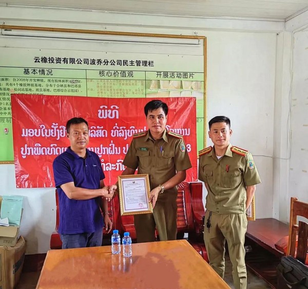 7月6日,老撾波喬省公安廳罌粟替代種植檢查考核領導小組副組長坎恩·酸巴帝到云橡投資有限公司波喬分公司頒發(fā)“罌粟替代種植優(yōu)秀企業(yè)”證書。