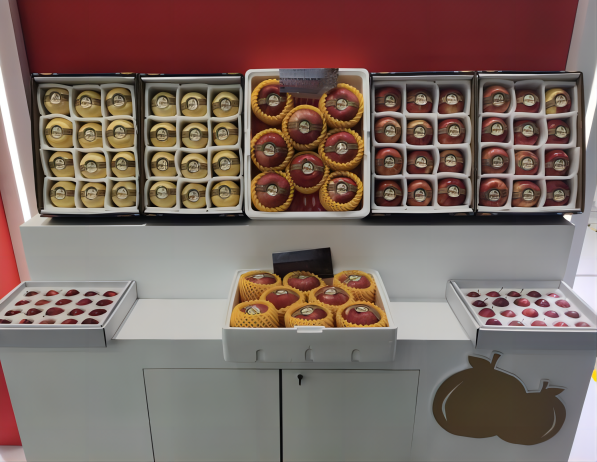 產(chǎn)品特色:“王鳳臺”紅富士:果面潔凈、色澤艷麗、品質(zhì)優(yōu)良。果實為大型果,平均單果重180-300克。果實多為扁圓形,果形指數(shù)0.8左右,少數(shù)果近圓形。果皮光滑,有光澤,中厚而韌,蠟質(zhì)中多。套袋成熟果實果面鮮紅色霞或條霞。果點圓形,較明顯,中大,較密,陽面果點黃白色,陰面果點黃色。果肉黃白色,致密,細(xì)脆多汁,有清香,酸甜適口。王鳳臺蘋果可溶性固形物含量不低于14.5%,酸含量在0.2%—0.3%,果實硬度8.5kg/cm2~11kg/cm2。10月中下旬成熟既可鮮食,亦可加工成果脯、果干、罐頭、果酒及果醬等。蘋果的耐貯性非常好,貯藏后伴有香氣,可貯至翌年六月。
