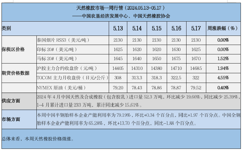 天然橡膠、大豆、玉米市場一周行情(2024.05.13-05.17)