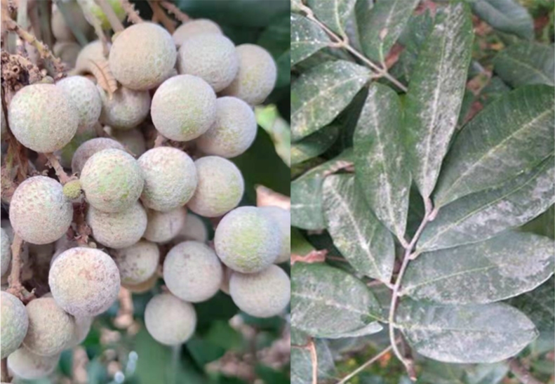 廣東與廣西是我國(guó)龍眼的重要主產(chǎn)區(qū),現(xiàn)正陸續(xù)進(jìn)入采收旺季。今年夏季持續(xù)高溫高濕,導(dǎo)致部分果園龍眼白霉病發(fā)生嚴(yán)重。該病主要為害接近成熟的龍眼果實(shí)及葉片,往往先發(fā)生在樹(shù)冠中下層枝葉稠密的果穗或葉片上。在果實(shí)上,病菌菌絲和孢子形成的一層白色霉?fàn)钗锟筛采w整個(gè)果實(shí)表面,導(dǎo)致部分果枝干枯和果實(shí)脫落或果皮暗褐色、果肉變質(zhì)腐爛;中度和輕度發(fā)病的果實(shí),雖果肉未腐爛,但品質(zhì)與風(fēng)味下降。受害葉片則正面覆蓋有一層白色霉?fàn)钗?,雖不形成壞死病斑,但引致葉片早衰。