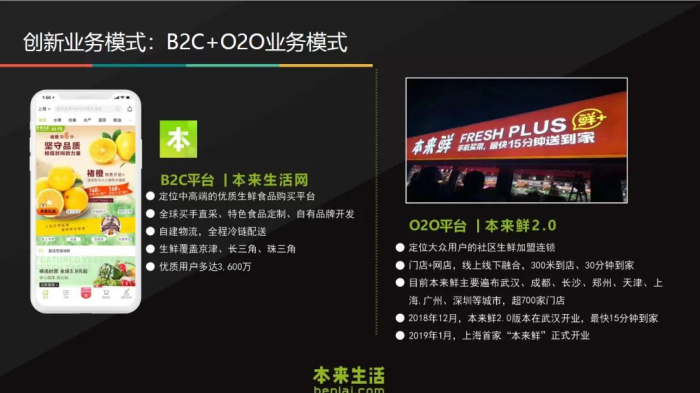 本來集團(tuán)創(chuàng)辦于2012年7月,是一家同時具備農(nóng)產(chǎn)品供應(yīng)鏈全程化管理服務(wù)、自有品牌塑造、媒體整合營銷、自有冷鏈物流、線上生鮮電商、社區(qū)生鮮連鎖新零售等綜合能力的生鮮全產(chǎn)業(yè)鏈集團(tuán)公司,致力于改善食品安全現(xiàn)狀、倡導(dǎo)健康生活方式,憑借八年來在生鮮領(lǐng)域的不斷探索與創(chuàng)新,本來集團(tuán)成功建立起O2O(社區(qū)生鮮連鎖本來鮮)+B2C(本來生活網(wǎng))的新零售模型,該模式可以同時解決時效、新鮮度、流量、履約成本的要求,通過線上線下渠道的打通、互補(bǔ),圍繞供應(yīng)鏈、零售端、用戶端創(chuàng)造價值。