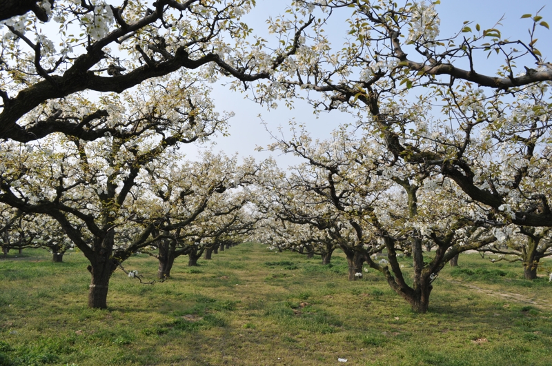 碭山,位于蘇、魯、豫、皖四省交界處,素有“世界梨都”之稱,每年陽春三月,春和景明時節(jié),碭山大地萬物復(fù)蘇,故黃漲綠,數(shù)十萬畝梨花吐蕊綻蕾,競相盛開。放眼環(huán)顧,雪堆云涌,銀波瓊浪,沃野千頃,一片花海,景象蔚為壯觀。到八月中秋,遍地金珠墜地,碭山又是果的世界,田間地頭又成了果山果海,到處人歡車鳴,芳香鋪地。置身其間,徜徉園圃,品嘗酥梨似蜜之甘甜,令人樂不思歸,流連忘返。始建于1955年的安徽農(nóng)墾碭山果園場就坐落在這里。