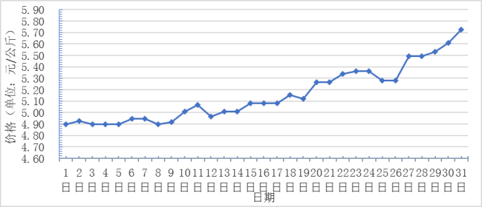 5月,全國重點監(jiān)測農(nóng)產(chǎn)品批發(fā)市場香蕉總交易量達2.6萬噸,同比上漲13.0%,環(huán)比下降16.1%;總交易價值13112.7萬元,同比下降19.9%,環(huán)比下降20.7%。日平均價格最高為5.7元/千克,最低為4.9元/千克,全月平均價格為 5.2元/千克,同比下降18.8%,環(huán)比下降3.7%(每日價格變化如圖)。