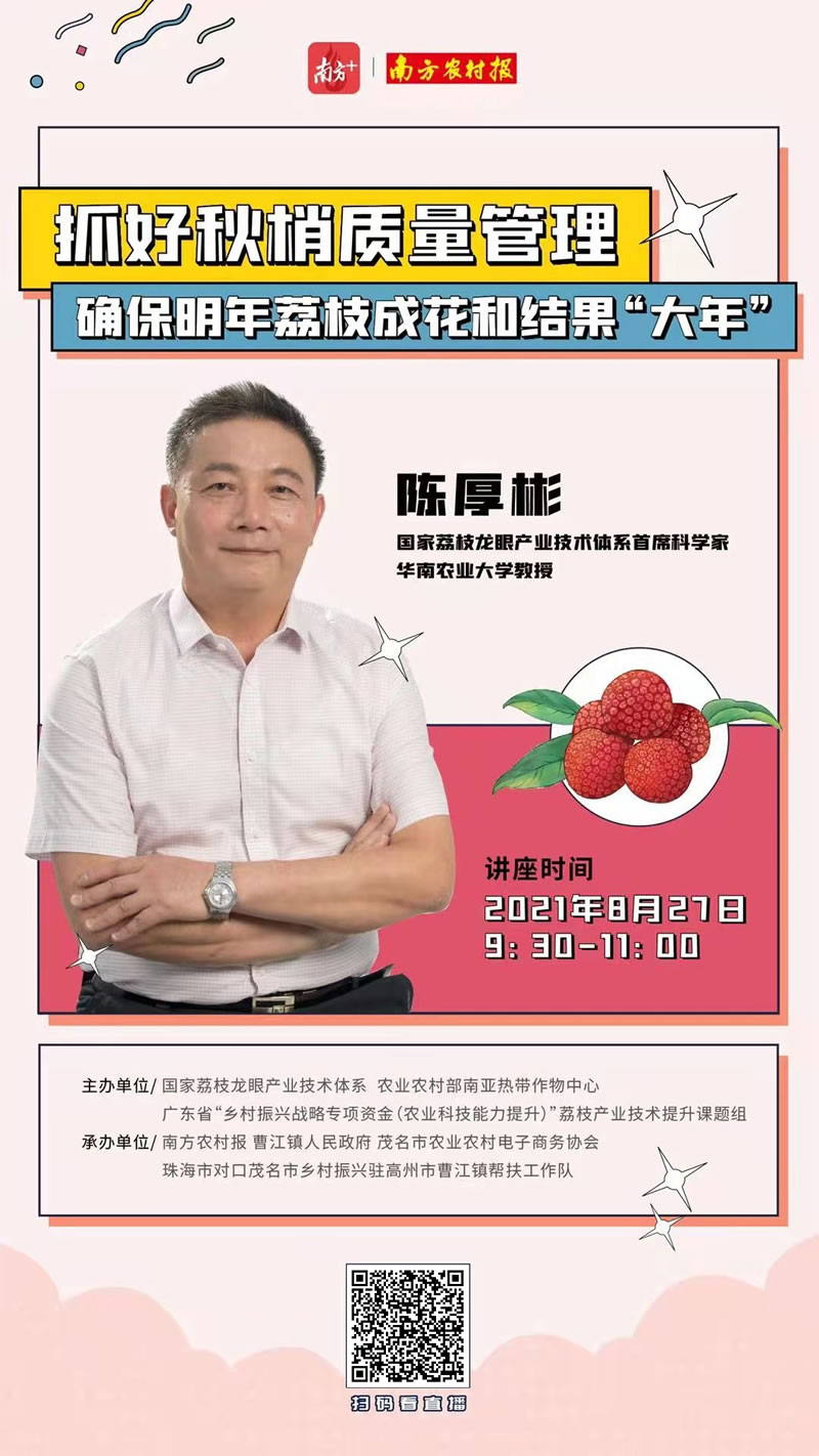 8月27日9:30,國家荔枝龍眼產(chǎn)業(yè)技術體系首席科學家、華南農(nóng)業(yè)大學教授陳厚彬主講的《抓好秋梢質(zhì)量管理,確保明年荔枝成花和結果“大年”》將在高州市曹江鎮(zhèn)黨群服務中心舉辦。本次講座由國家荔枝龍眼產(chǎn)業(yè)技術體系、農(nóng)業(yè)農(nóng)村部南亞熱帶作物中心和廣東省“鄉(xiāng)村振興戰(zhàn)略專項資金(農(nóng)業(yè)科技能力提升)”荔枝產(chǎn)業(yè)技術提升課題組主辦,南方農(nóng)村報、曹江鎮(zhèn)人民政府、茂名市農(nóng)業(yè)農(nóng)村電子商務協(xié)會、珠海市對口茂名市鄉(xiāng)村振興駐高州市曹江鎮(zhèn)幫扶工作隊承辦,為來年荔枝的保果穩(wěn)產(chǎn)保駕護航。