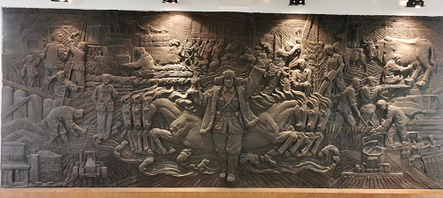場史館主題銅質(zhì)浮雕由中央美院壁畫系教師杜飛制作,位于館中心,與正門相對,長6米,高2米。浮雕以“十六掛馬車建場”為主題,集中反映了農(nóng)場艱苦創(chuàng)業(yè)、奮斗、勇于開拓的輝煌歷程。