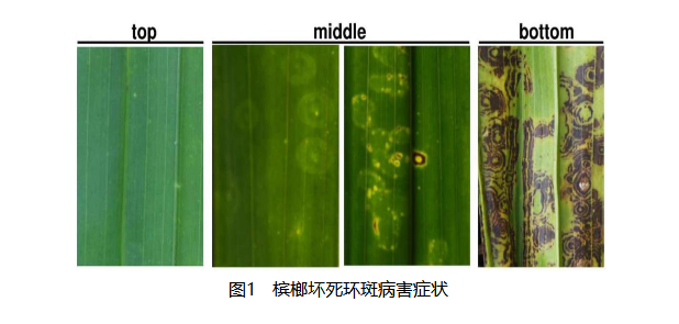 當前,海南定安、瓊海、萬寧、瓊中、陵水、保亭等主產(chǎn)區(qū)的檳榔正處于果實的采收期和新苗的定植期,果園內(nèi)溫度適宜、濕度適中,利于傳播檳榔壞死環(huán)斑病毒的刺吸式傳毒昆蟲的生長繁殖,易造成檳榔壞死環(huán)斑病害的大面積流行。該病害發(fā)病初期在新葉基部隱約可見褪綠環(huán)斑,逐漸在中部及底部葉片出現(xiàn)壞死環(huán)斑(見圖),直至葉片徹底壞死。發(fā)病檳榔的葉片稀疏、下垂或伴有黃化現(xiàn)象,嚴重影響檳榔長勢及果實產(chǎn)量。