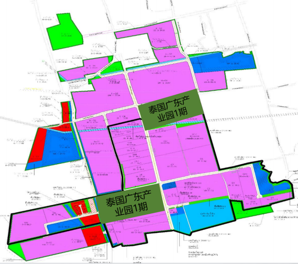 泰國廣東產(chǎn)業(yè)園總規(guī)劃6000畝,總投資額22億元人民幣。1期可開發(fā)面積332.89萊(約800畝,圖中深綠色地塊),2期可開發(fā)面積1455.91萊(約3495畝,圖中黑框外紫色地塊),3期規(guī)劃設(shè)計(jì)土地面積710萊(約1705畝)。