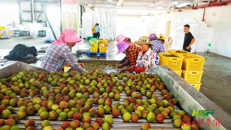 海墾紅明農(nóng)場(chǎng)公司擁有全國(guó)最大的荔枝鮮果交易中心,可為客商提供分揀、打包裝箱、冷鏈倉(cāng)儲(chǔ)物流、冰袋等一體化服務(wù)。許雅 攝