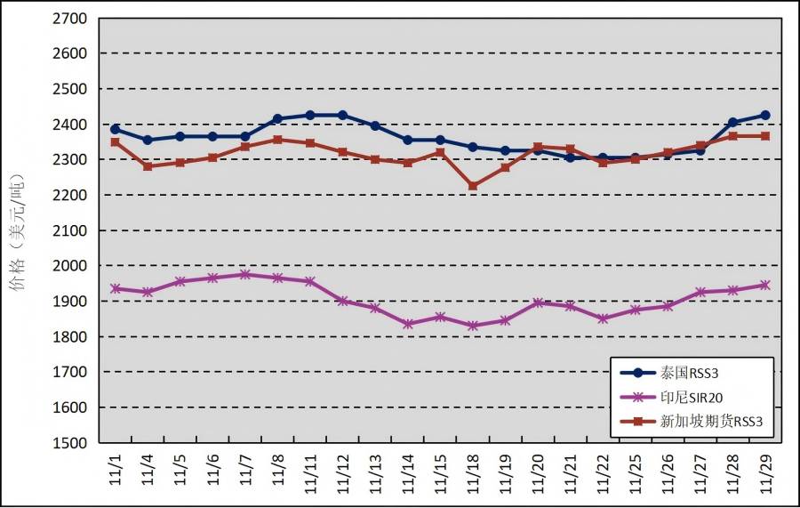 國外主產(chǎn)區(qū):11月,泰國RSS3平均價(jià)格為2361美元/噸,環(huán)比下跌354美元/噸,最高價(jià)為2425美元/噸,最低價(jià)為2305美元/噸;印尼SIR20平均價(jià)格為1905美元/噸,環(huán)比下跌51美元/噸,最高價(jià)為1975美元/噸,最低價(jià)為1830美元/噸;新加坡RSS3期貨主力合約月均結(jié)算價(jià)格為2316美元/噸,環(huán)比下跌261美元/噸,最高價(jià)為2366美元/噸,最低價(jià)為2225美元/噸。