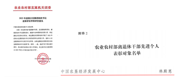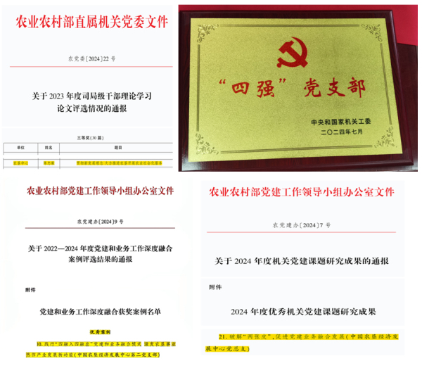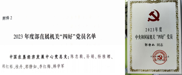 11.中心黨員干部持續(xù)加強(qiáng)黨性鍛煉,創(chuàng)優(yōu)爭先,獲得表彰9人次。郭靜如同志獲2023年度中央和國家機(jī)關(guān)“四好”黨員稱號,陳忠毅、孫娟、楊雅娜、鄭紅裕、桂丹、郭靜如、李紅梅、韓學(xué)軍等同志獲得2023年度農(nóng)業(yè)農(nóng)村部直屬機(jī)關(guān)“四好”黨員稱號。