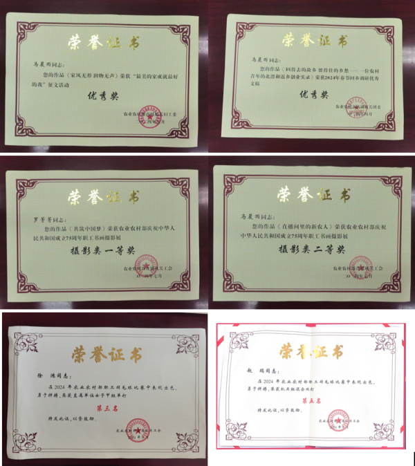 12.中心干部職工積極創(chuàng)優(yōu)爭先,獲得榮譽(yù)表彰8項(xiàng)。葉瑞云同志在農(nóng)業(yè)農(nóng)村部“以秋補(bǔ)夏、抗災(zāi)奪豐收”專項(xiàng)任務(wù)中獲個(gè)人記功,劉芳、樊思雨同志獲個(gè)人嘉獎(jiǎng)。李泓同志獲得2023年度農(nóng)業(yè)農(nóng)村部平安建設(shè)先進(jìn)個(gè)人稱號。劉陽同志獲得2022—2023年度部直屬機(jī)關(guān)優(yōu)秀工會干部榮譽(yù)稱號。馬晨雨同志在2023年度部分直屬團(tuán)組織書記述職評議考核被評價(jià)為“好”。季剛同志獲得2021—2023年度農(nóng)業(yè)農(nóng)村部直屬機(jī)關(guān)青年理論學(xué)習(xí)標(biāo)兵榮譽(yù)稱號。林殿惠獲得農(nóng)業(yè)農(nóng)村部系統(tǒng)離退休干部先進(jìn)個(gè)人榮譽(yù)稱號。