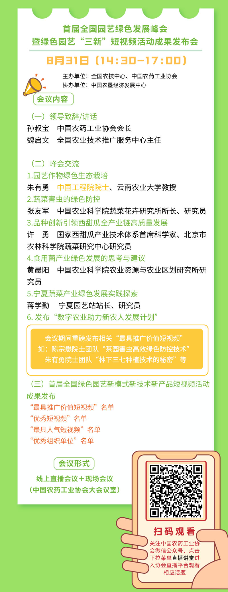 為深入貫徹落實(shí)綠色發(fā)展理念,用新方式推廣園藝綠色生產(chǎn)新模式、新技術(shù)、新產(chǎn)品,助推提高園藝產(chǎn)業(yè)質(zhì)量效益與競(jìng)爭(zhēng)力和保障重要農(nóng)產(chǎn)品有效供給,全國(guó)農(nóng)技中心會(huì)同中國(guó)農(nóng)藥工業(yè)協(xié)會(huì)聯(lián)合舉辦首屆全國(guó)綠色園藝新模式新技術(shù)新產(chǎn)品(以下簡(jiǎn)稱“三新”)短視頻學(xué)習(xí)交流活動(dòng)。各地農(nóng)技部門(mén)、科研教學(xué)單位園藝生產(chǎn)主體和農(nóng)資服務(wù)主體等積極參加,共制作了300多個(gè)“三新”短視頻用于學(xué)習(xí)交流,活動(dòng)組委會(huì)從中推評(píng)出了一批最具推廣價(jià)值短視頻和優(yōu)秀短視頻。為進(jìn)一步擴(kuò)大活動(dòng)宣傳覆蓋面,中國(guó)農(nóng)藥工業(yè)協(xié)會(huì)將于2021年8月31日以線上直播形式舉辦首屆全國(guó)園藝綠色發(fā)展峰會(huì)暨“三新”短視頻學(xué)習(xí)交流活動(dòng)成果發(fā)布會(huì)。
