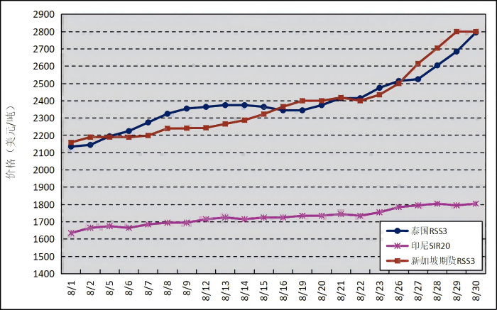 國(guó)外主產(chǎn)區(qū):8月,泰國(guó)RSS3平均價(jià)格為2392美元/噸,環(huán)比上漲680美元/噸,最高價(jià)為2795美元/噸,最低價(jià)為2135美元/噸;印尼SIR20平均價(jià)格為1728美元/噸,環(huán)比上漲103美元/噸,最高價(jià)為1805美元/噸,最低價(jià)為1635美元/噸;新加坡RSS3期貨主力合約月均結(jié)算價(jià)格為2380美元/噸,環(huán)比上漲293美元/噸,最高價(jià)為2800美元/噸,最低價(jià)為2159美元/噸。