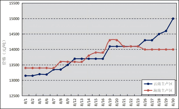 國(guó)內(nèi)主產(chǎn)區(qū):8月,云南產(chǎn)區(qū)持續(xù)降雨影響收膠進(jìn)程,原料供應(yīng)緊張,帶動(dòng)收購(gòu)價(jià)格走高。海南產(chǎn)區(qū)天氣對(duì)割膠影響相對(duì)較小,原料供應(yīng)穩(wěn)定。云南、海南鮮膠乳(折干膠)月均價(jià)格分別為13854元/噸、13814元/噸,環(huán)比上漲447元/噸、197元/噸。