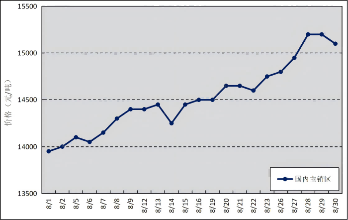 國(guó)內(nèi)主銷區(qū):8月,上海、青島和天津等銷區(qū)市場(chǎng)的國(guó)產(chǎn)全乳標(biāo)準(zhǔn)膠平均價(jià)格為14518元/噸,環(huán)比上漲314元/噸,最高價(jià)為15200元/噸,最低價(jià)為13950元/噸。