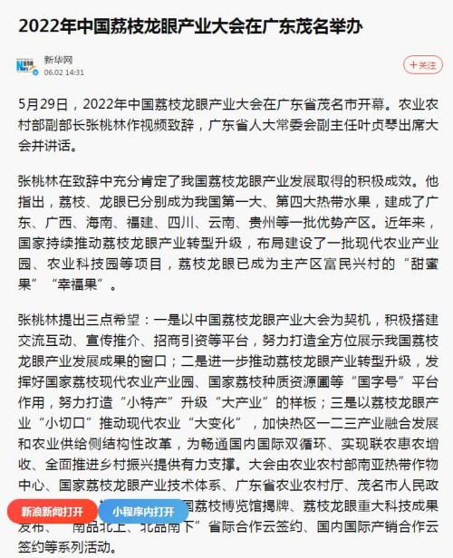 1.2022年5月,熱作發(fā)展處在廣東茂名成功舉辦2022年中國荔枝龍眼產業(yè)大會,大會發(fā)布了《中國·茂名荔枝產業(yè)發(fā)展白皮書(2022)》、荔枝龍眼重大科技成果等,有效帶動荔枝龍眼產業(yè)發(fā)展,獲農業(yè)農村部張?zhí)伊指辈块L、廣東省委常委王瑞軍的肯定性批示,有關情況被人民網、新華網等中央主流媒體報道。