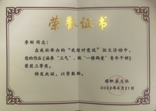 5.郭靜如同志獲農業(yè)農村部系統黨章黨規(guī)黨紀知識競賽黨員干部組三等獎;季剛同志獲旗幟雜志“我想對黨說”征文活動三等獎;張若凡同志獲農業(yè)農村部直屬機關團委“奮進新征程 建功新時代”青年干部學習交流活動優(yōu)秀獎。