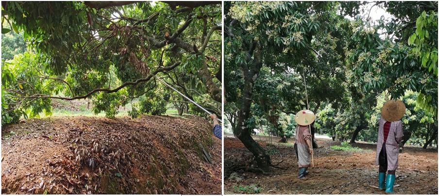圖3 鋸除貼于地面的枝條(左)及雨后搖振花穗上水珠(右)