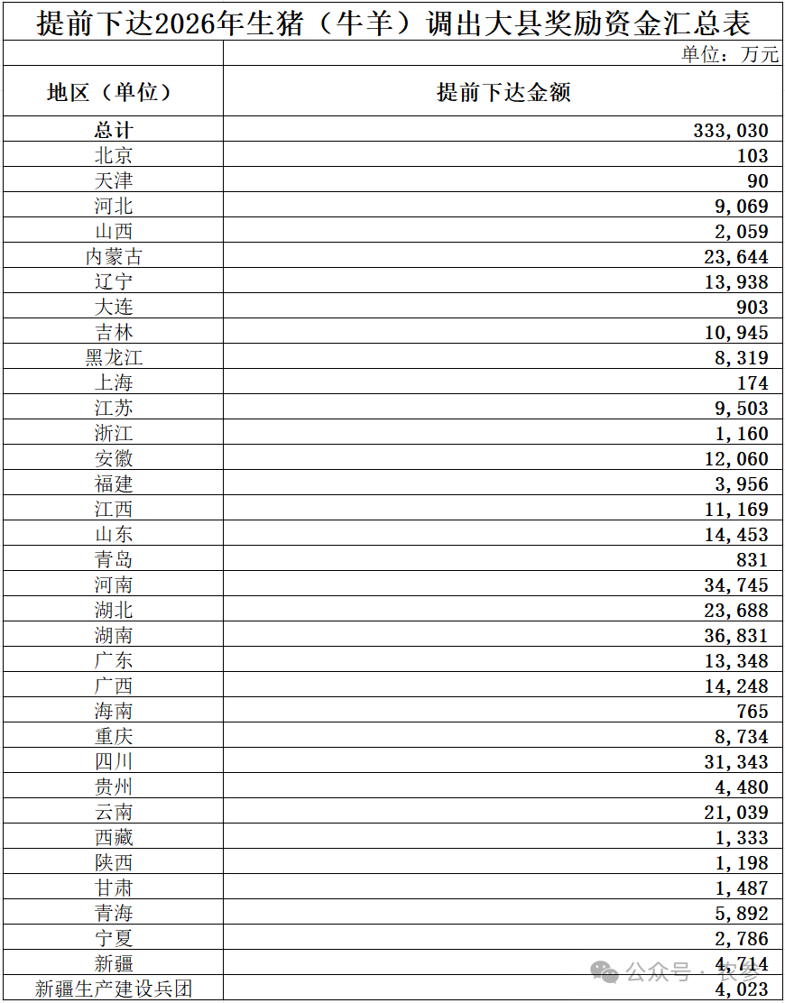 附件:提前下達(dá)2026年生豬(牛羊)調(diào)出大縣獎(jiǎng)勵(lì)資金匯總表