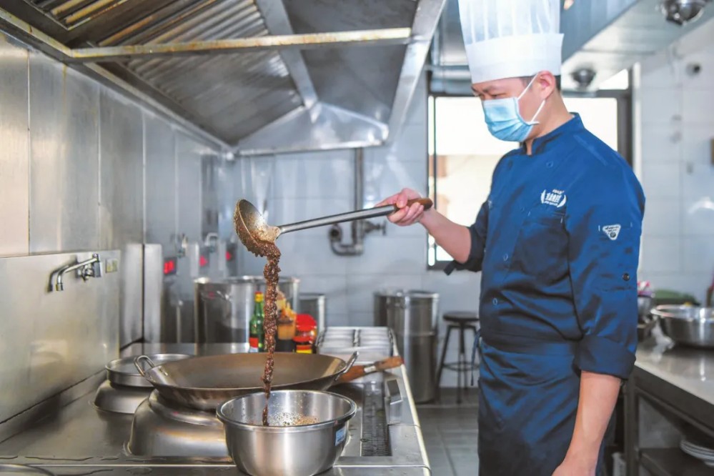 在金盤食驗室的后廚,工作人員正在加工胡椒益智辣椒醬。海口日報記者 蘇弼坤 攝