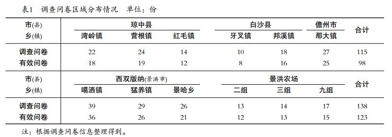 在我國適宜種植天然橡膠的地區(qū)包括海南省、云南省、廣東省及福建部分地區(qū),其中海南省與云南省天然橡膠產(chǎn)量占全國總產(chǎn)量的90%以上。因此,本文選擇海南省與云南省內(nèi)的部分民營橡膠為研究對(duì)象。根據(jù)本文研究內(nèi)容,以在2013年8月對(duì)云南西雙版納地區(qū),2013年11—12月在海南的瓊中縣、白沙縣、儋州市等地區(qū)考察為基礎(chǔ),天然橡膠產(chǎn)業(yè)經(jīng)濟(jì)崗位的研究人員于2014年6—8月在海南地區(qū)對(duì)民營膠農(nóng)割膠制度選擇行為進(jìn)行深入調(diào)查,2014年11月在云南西雙版納地區(qū)對(duì)民營膠農(nóng)割膠制度選擇行為進(jìn)行調(diào)研。