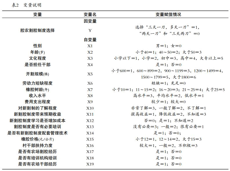 設(shè)計(jì)問卷調(diào)查表,實(shí)地調(diào)查膠農(nóng)對(duì)橡膠割制選 擇行為,分別對(duì)海南儋州白沙、瓊中、瓊海,云南西雙版納等地選取不同植膠水平的農(nóng)村進(jìn)行隨機(jī)抽樣調(diào)查,具體變量說明見表2。