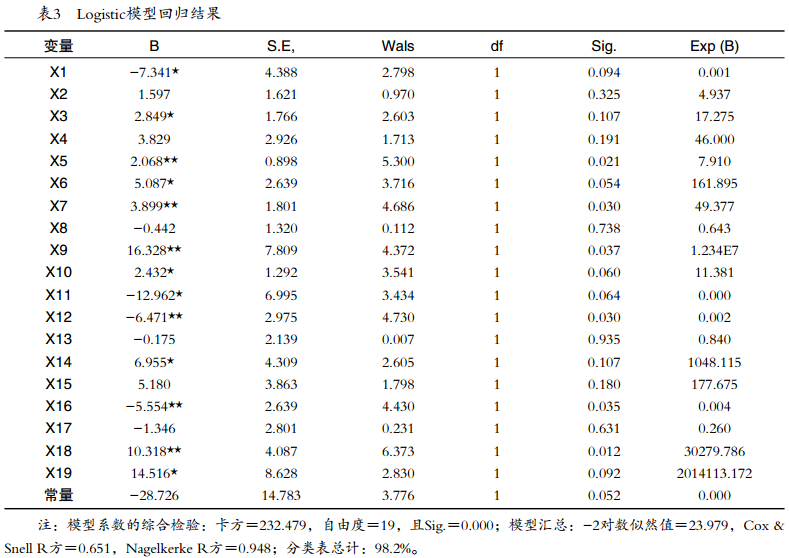 利用微觀調(diào)研數(shù)據(jù),從農(nóng)戶自身特征、家庭特征、割膠制度認(rèn)知特征、天然橡膠市場、基層組織環(huán)境角度的分析結(jié)果,對(duì)膠農(nóng)選擇割膠制度存在一定影響,本節(jié)從計(jì)量數(shù)學(xué)方法上分析民營膠農(nóng)選擇割膠制度的影響因素。二元Logistic模型是線性回歸逐漸發(fā)展的產(chǎn)物,當(dāng)被解釋變量、解釋變量中存在0/1二值品質(zhì)型變量時(shí),一般線性回歸模型不能夠滿足回歸分析,繼而選擇二元Logistic回歸模型。本文以我國民營膠農(nóng)割膠制度選擇情況為因變量,影響膠農(nóng)割膠制度選擇的變量為自變量,二元Logistic模型適合本文研究。
