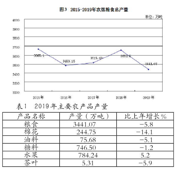 糧食總產(chǎn)量23441.07萬噸,比上年減少211.73萬噸,下降5.8%(見圖3)。主要農(nóng)產(chǎn)品產(chǎn)量見表1。
